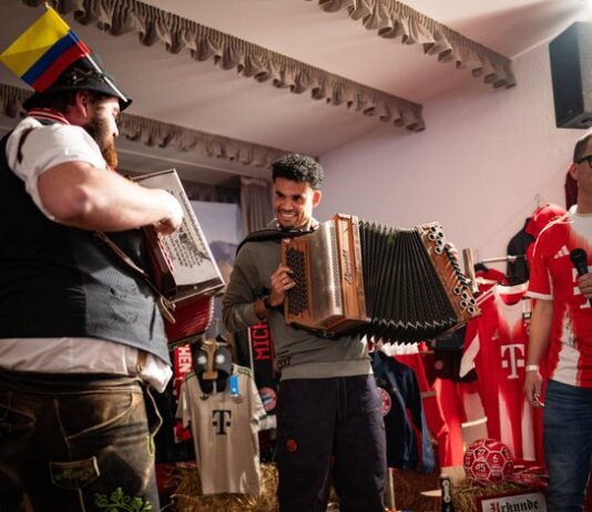 Lucho Díaz, del FC Bayern, probó el acordeón, en su visita a los Clubes de Fans